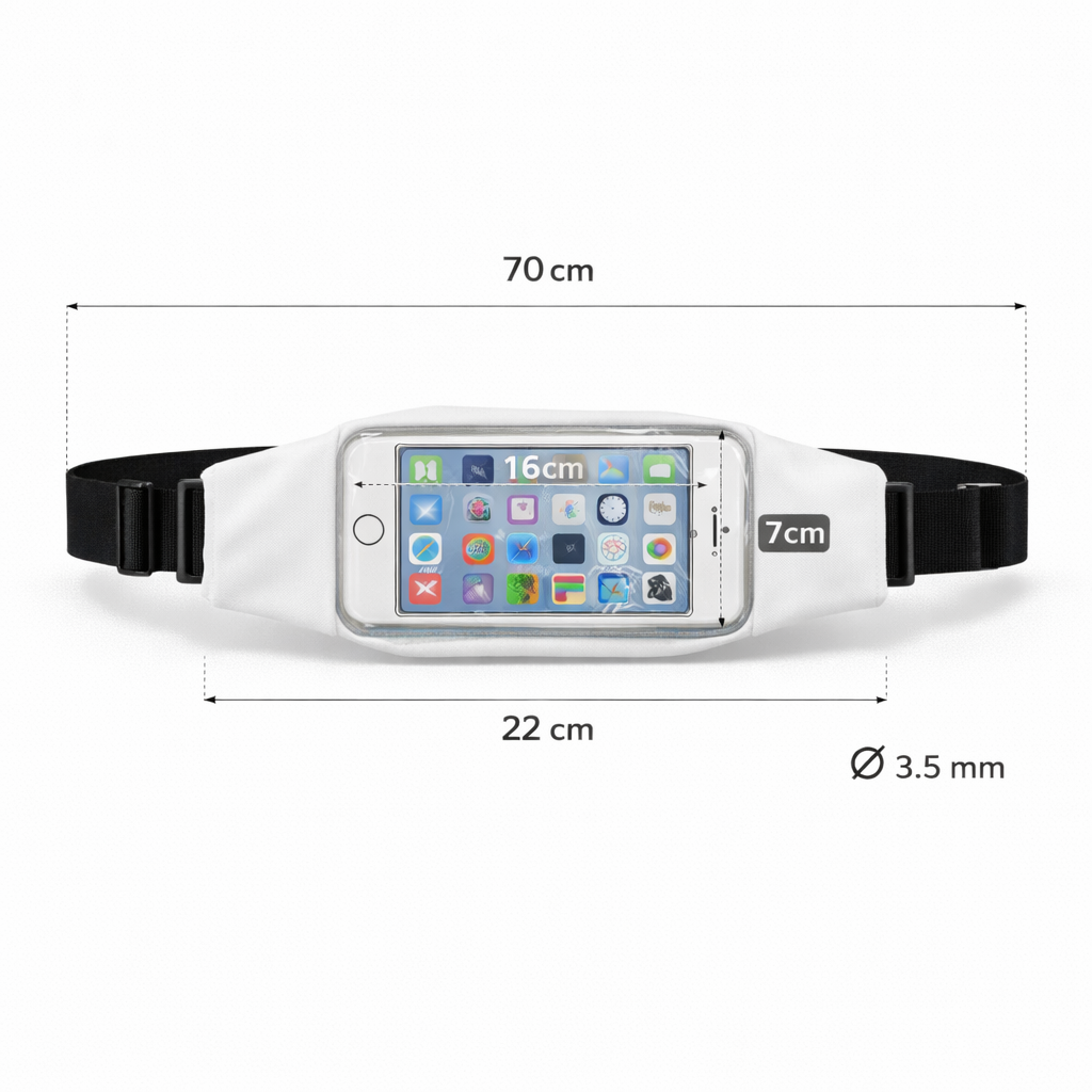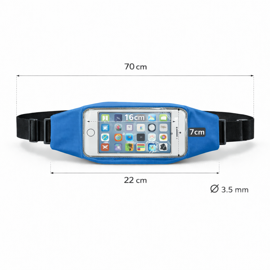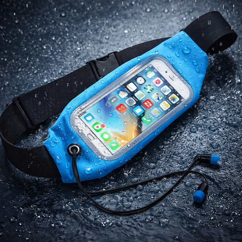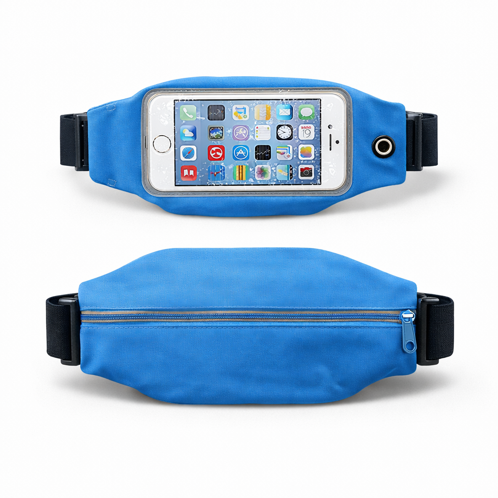 Es una riñonera deportiva diseñada para llevar el celular y objetos personales de forma segura mientras realizas actividades físicas. Cuenta con un compartimento transparente que permite usar la pantalla del teléfono sin necesidad de sacarlo.