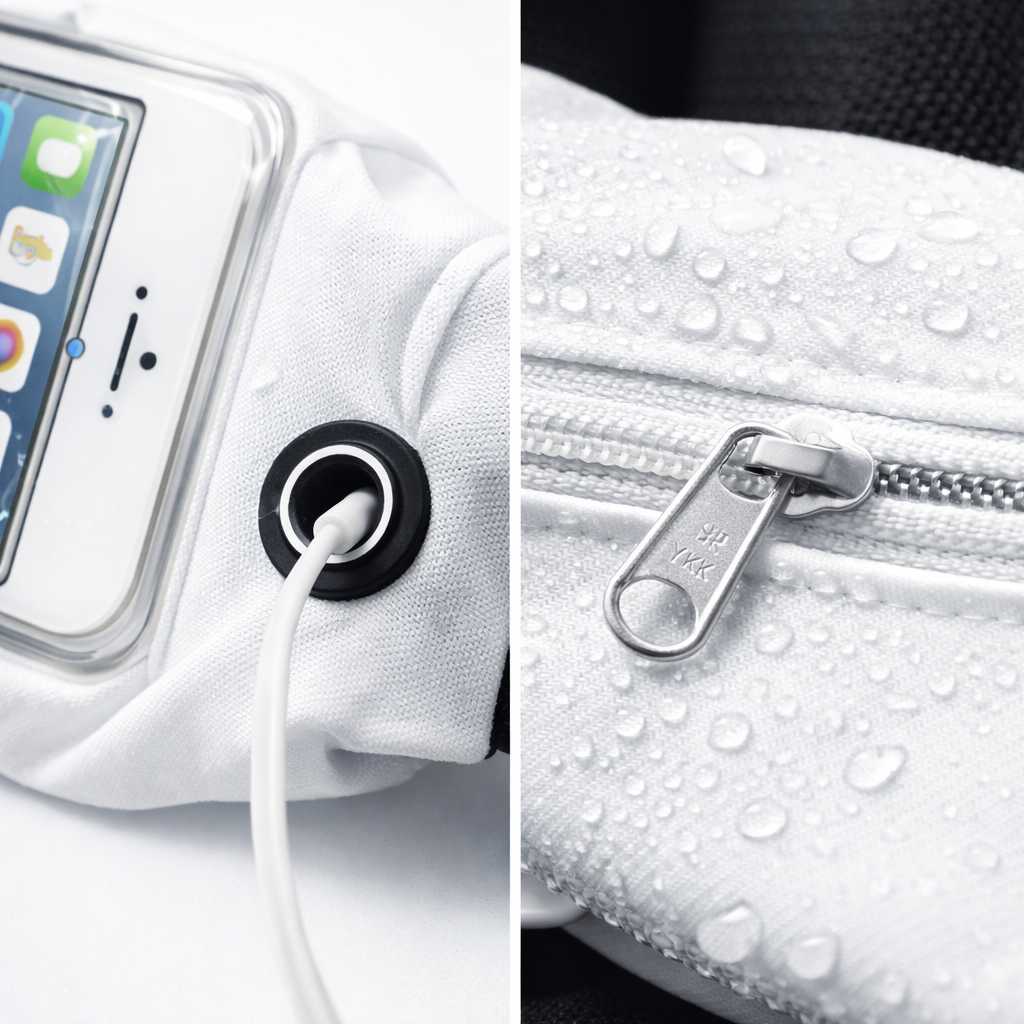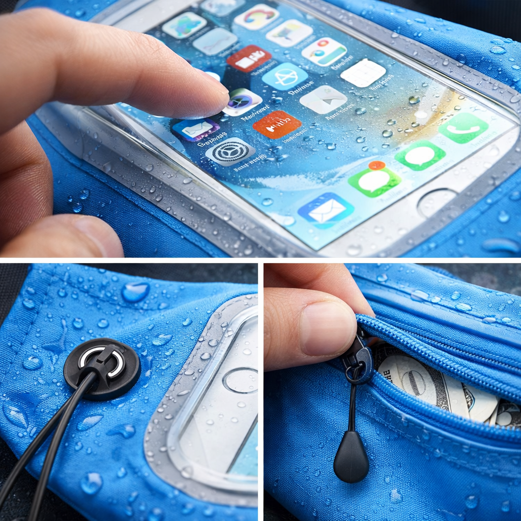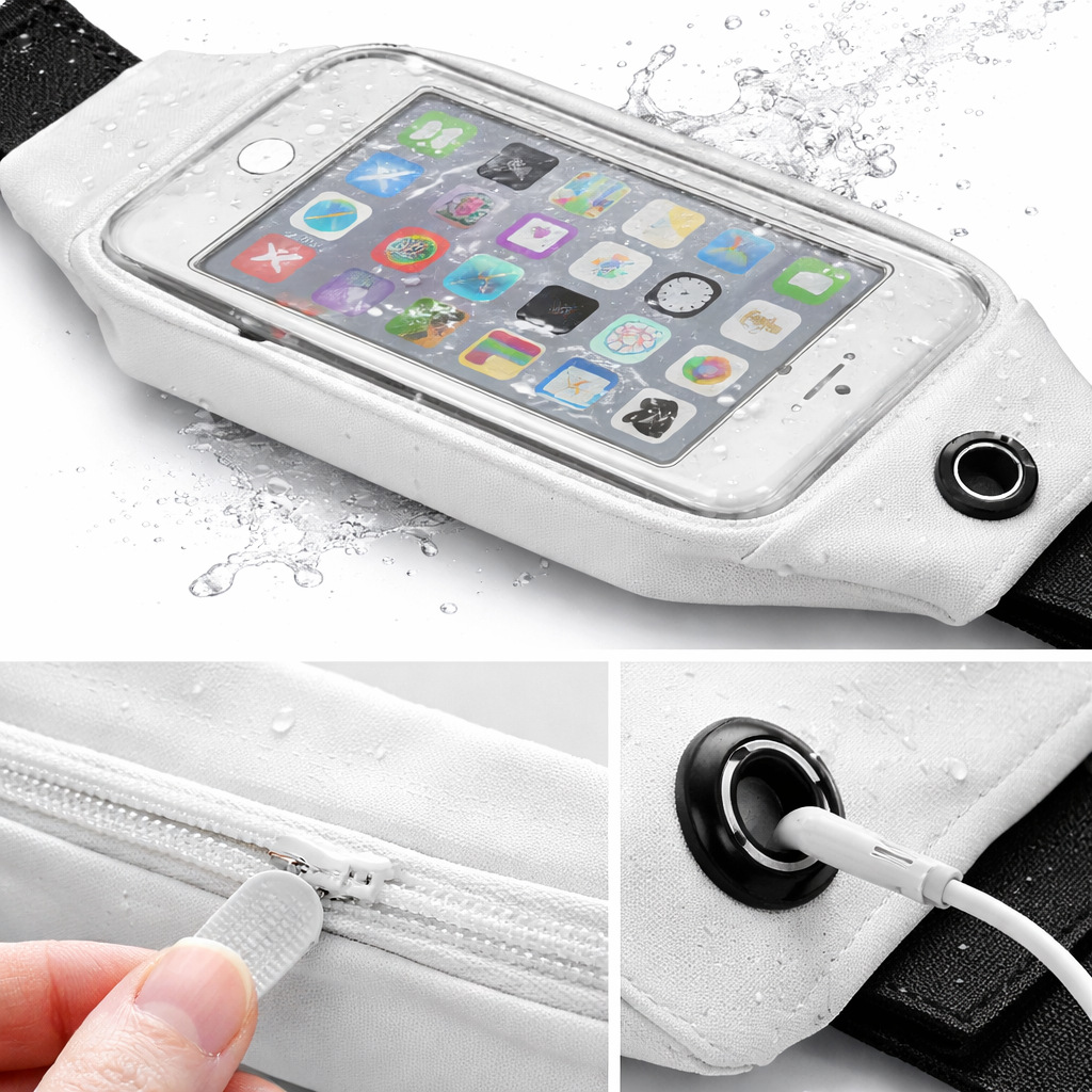 Sirve para transportar el celular, llaves, dinero o pequeños accesorios mientras corres, caminas, haces ejercicio o realizas actividades al aire libre. Su diseño impermeable protege el dispositivo del sudor y salpicaduras.